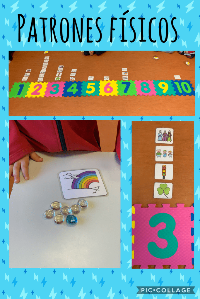 También contamos con las tarjetas de PATRONES FÍSICOS CON SIGNIFICADO, es decir, si les sale la tarjeta del arcoiris, tienen que contar tantas almendras como colores tiene el arcoiris.