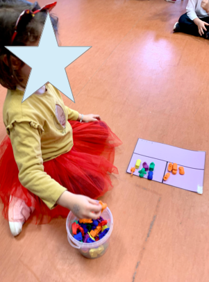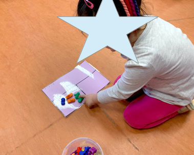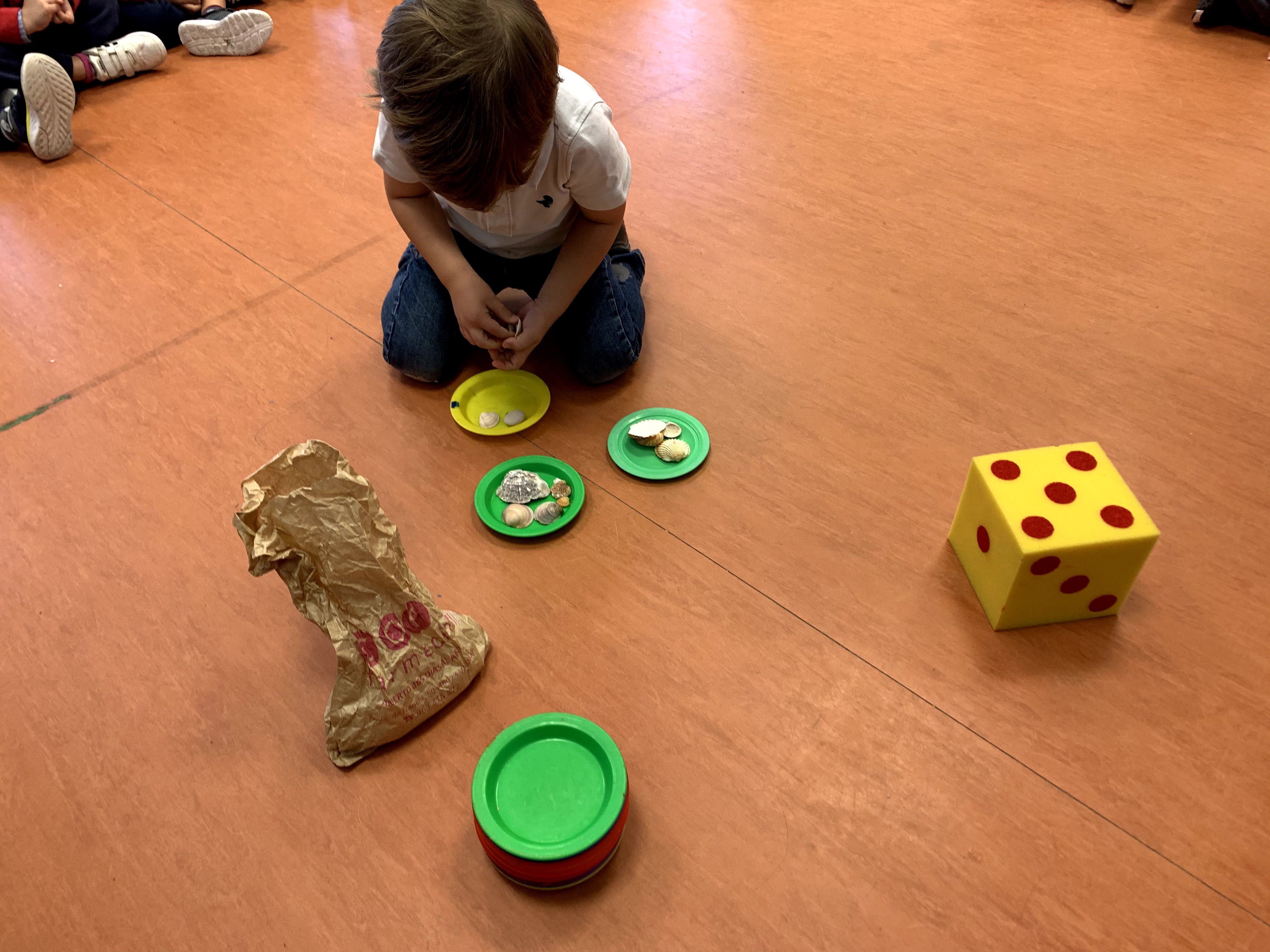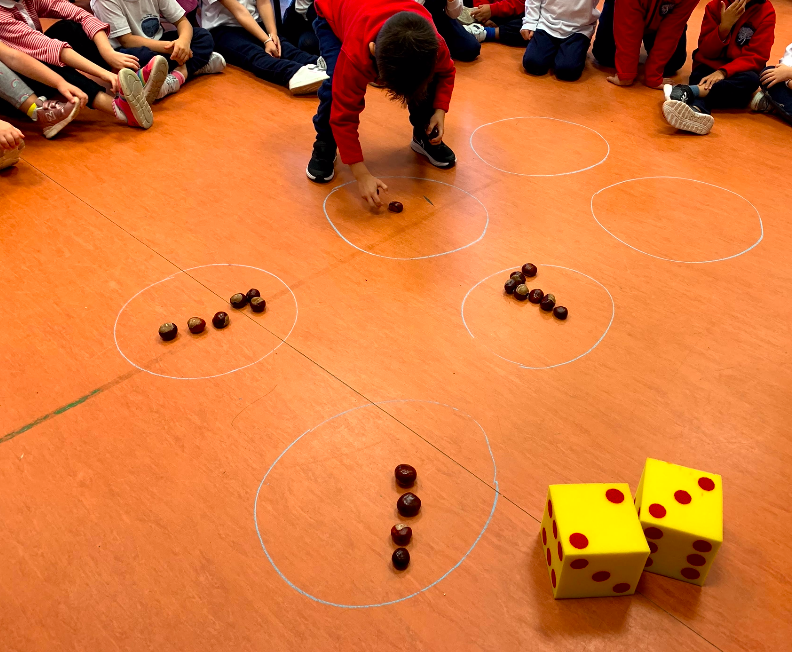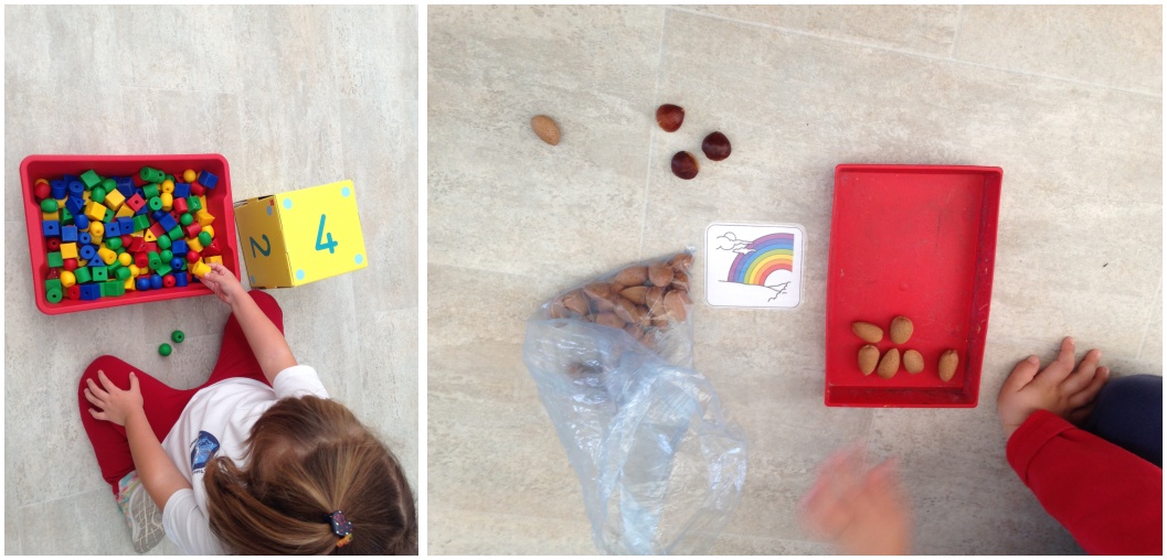 Sin duda, lo que más hemos hecho ha sido CONTAR. Hemos contado conchas, castañas, frutitas, policubos… A veces somos las profes las que indicamos qué cantidad han de poner y otras veces utilizamos dados, cartas o los dedos de las manos para indicar cuántos objetos han de poner («pon tantas conchas como puntos haya en el dado», «pon tantos cochecitos como dedos tengo en una mano»…).