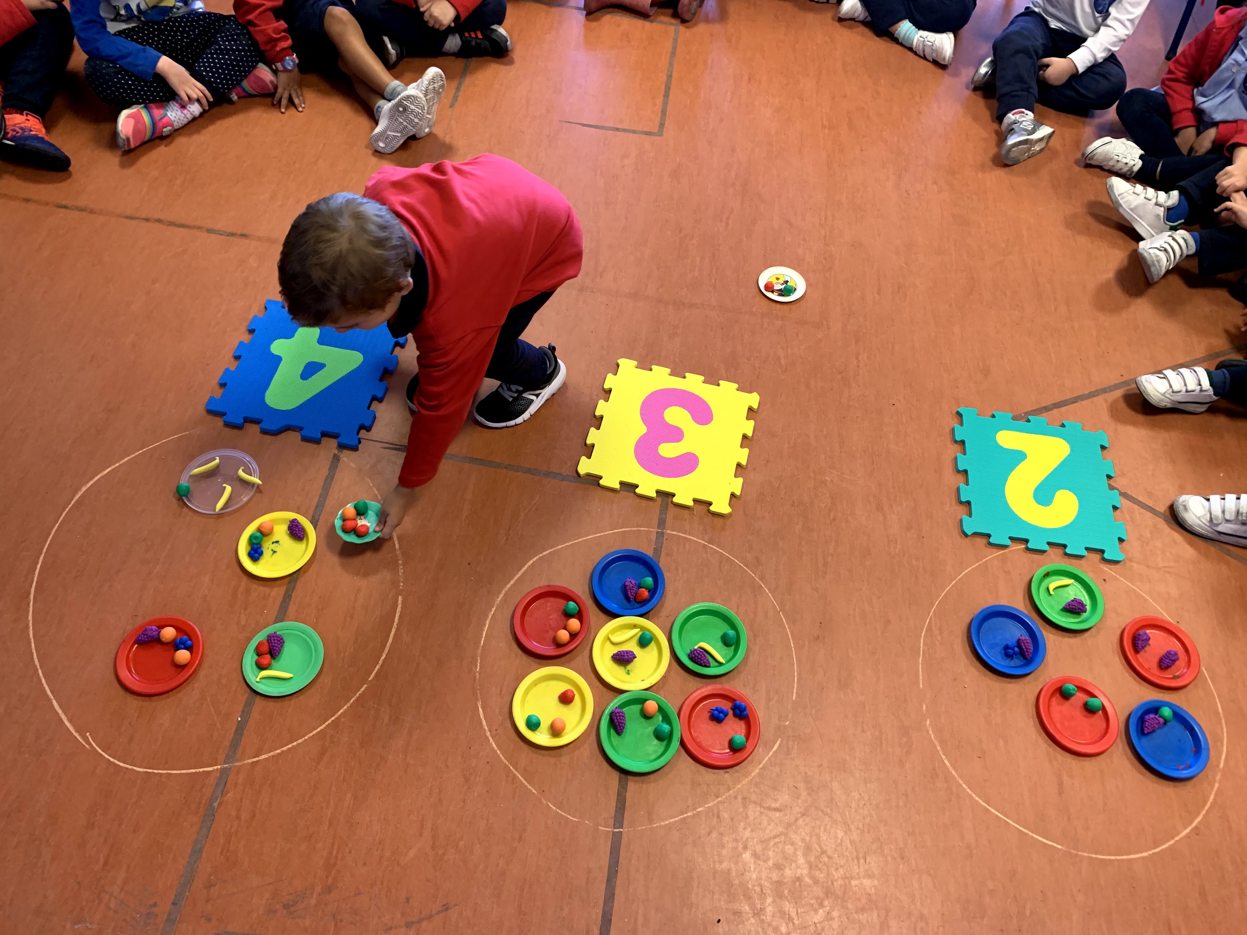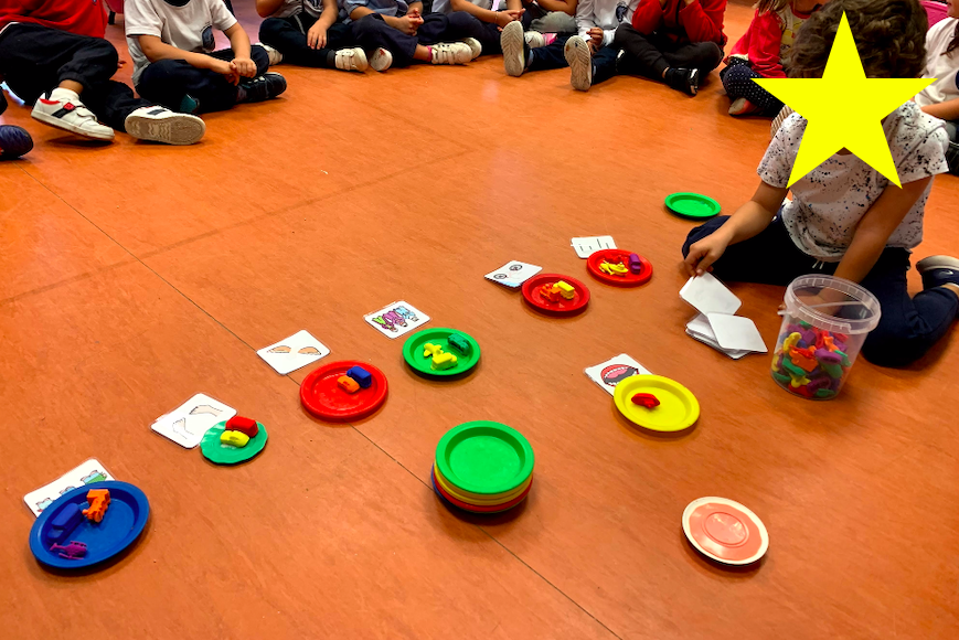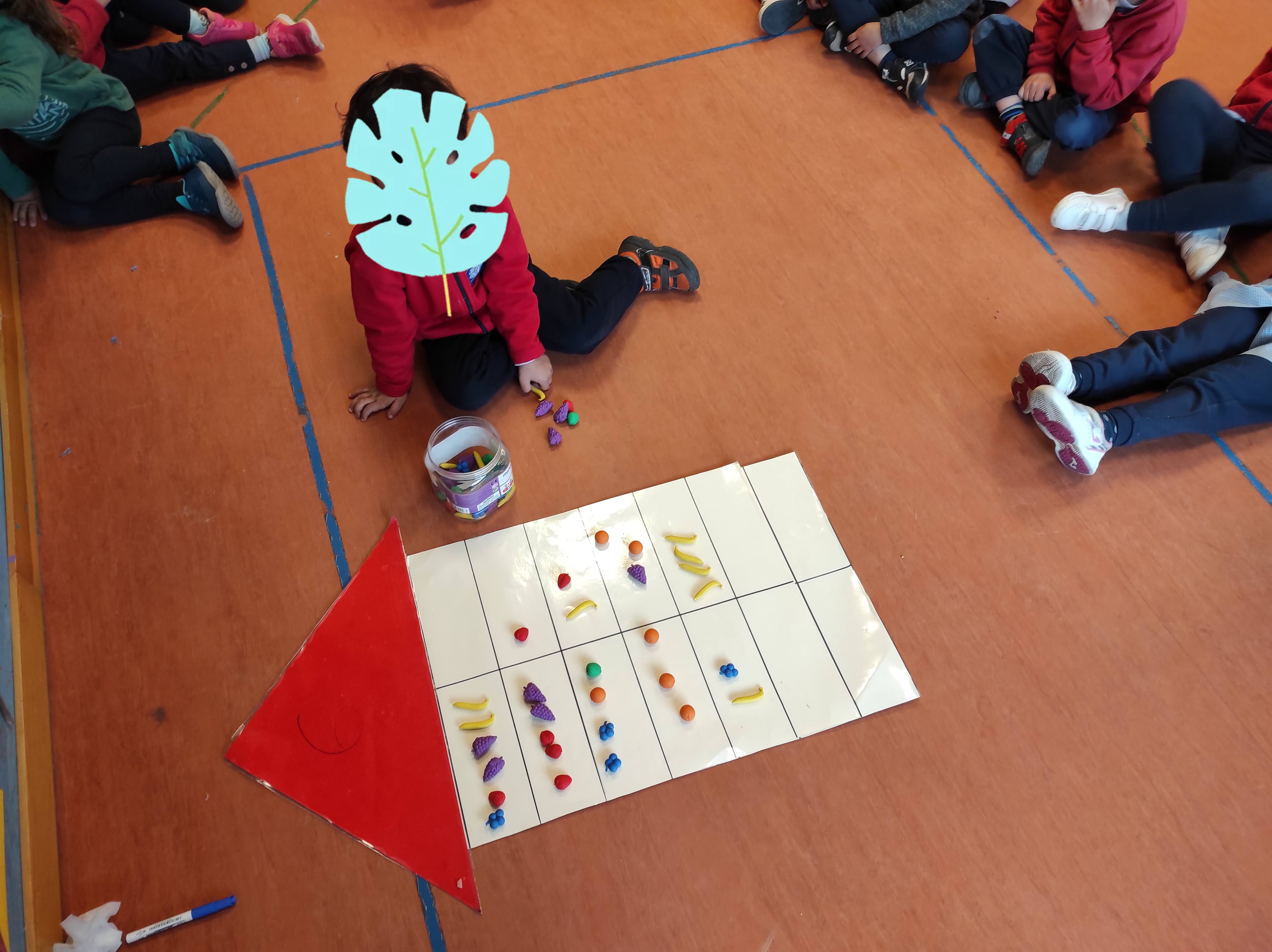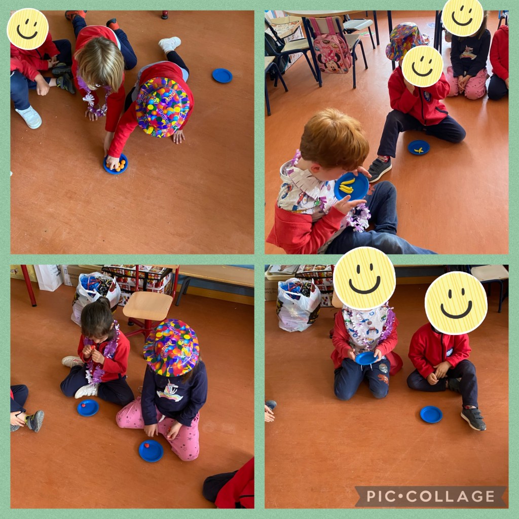 Para trabajar los repartos, jugamos en clase a la «Fiesta de la fruta». Dos o tres niños eran los invitados y otro niño tenía que repartirles la fruta de manera equitativa. Los invitados tenían que comprobar que todos tenían la misma cantidad de fruta en el plato. ¡Fue muy divertido!
