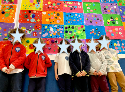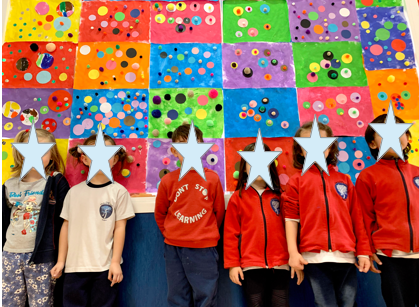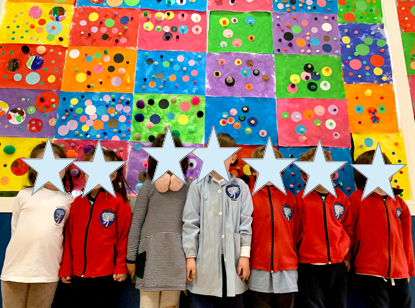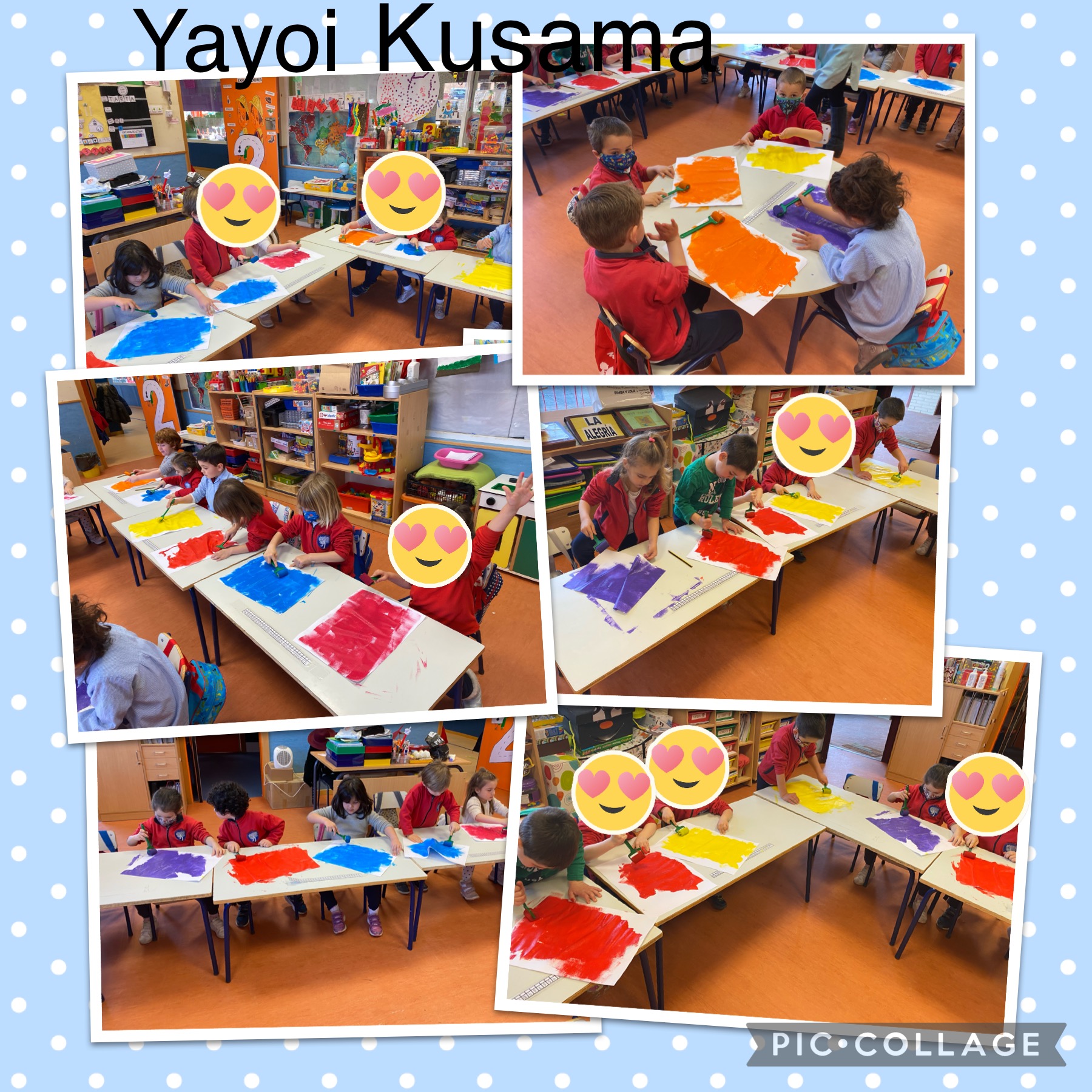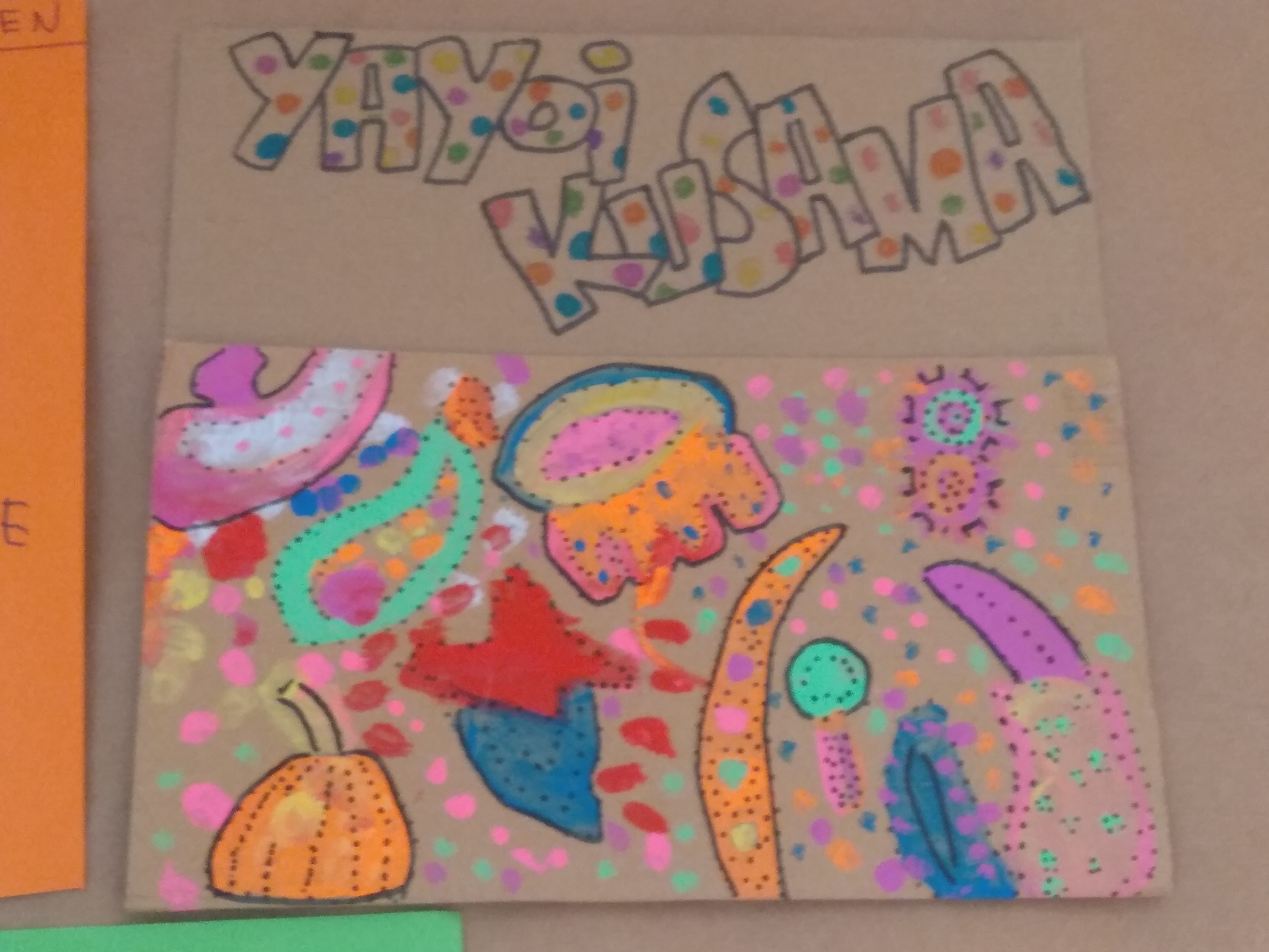 Hemos descubierto a Yayoi Kusama, una artista Japonesa que nos ha llamado mucho la atención tanto por su obra como por su personalidad. Hicimos un collage individual para luego formar una obra gigante en el pasillo en honor a la artista.