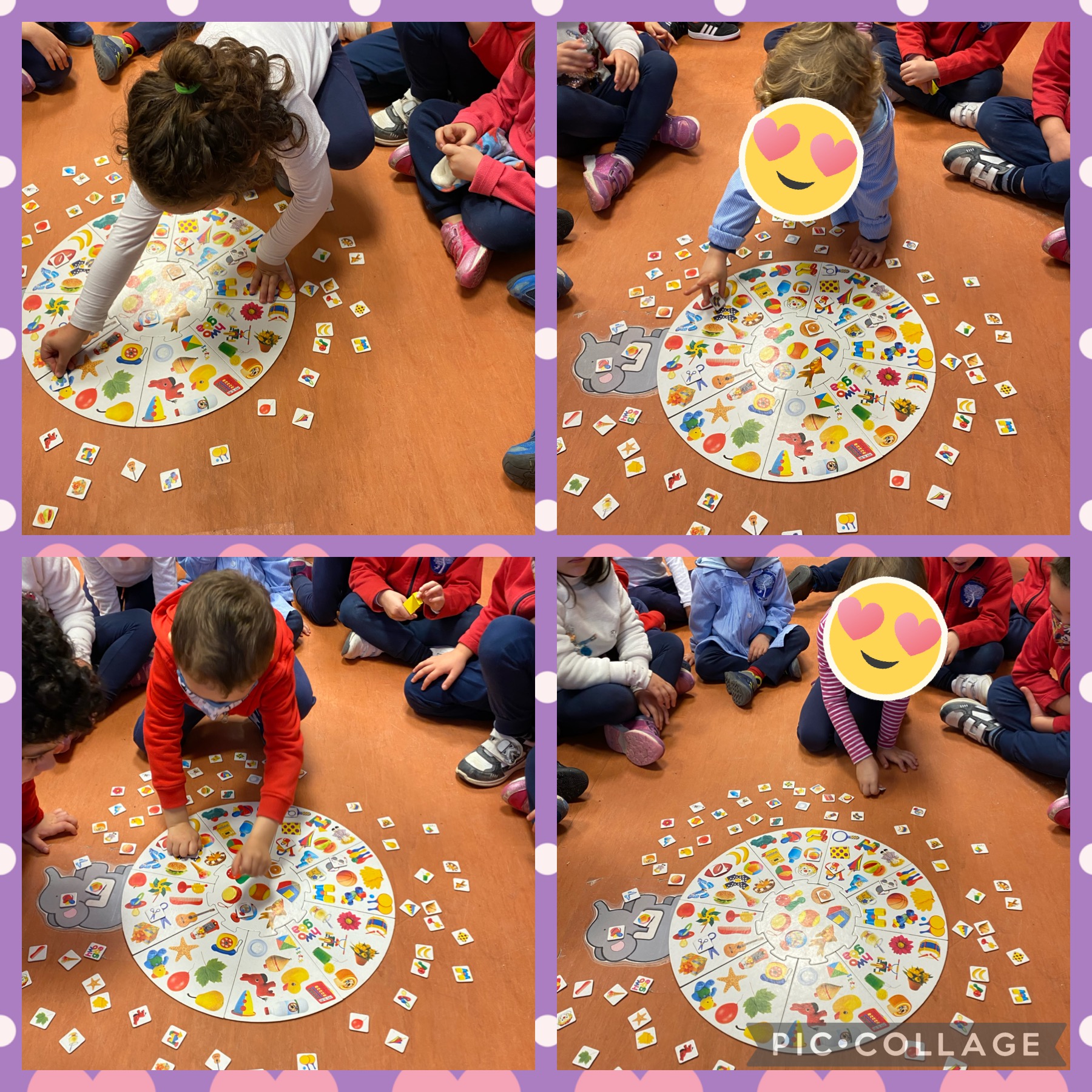 Consiste en sacar al azar una ficha con una imagen y los niños la tienen que buscar en el tablero en el menor tiempo posible. El que la vea primero se lleva la ficha y gana el que más fichas tenga.