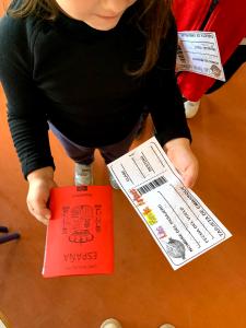Como actividad de motivación volamos con nuestra imaginación montados en un avión directos a Kenia. Nos preparamos a conciencia para este primer viaje, cada niño se preparó su pasaporte y su billete de avión para poder montar en el avión.