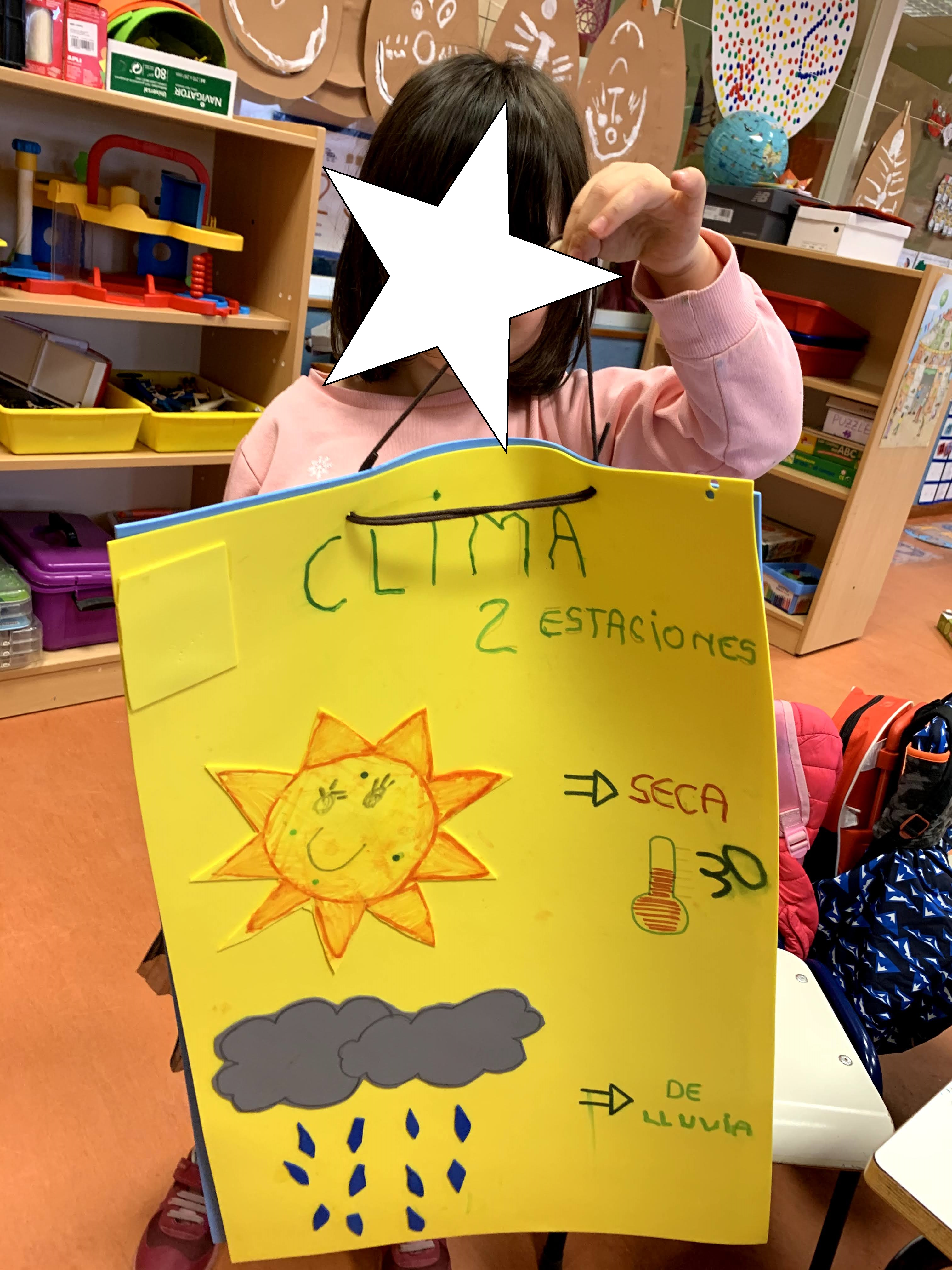 El encargado del día en clase mira qué tiempo hace y va metiendo una piedra o pompón el el bote del sol, las nubes, la lluvia… según corresponda.