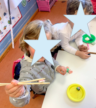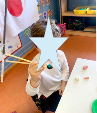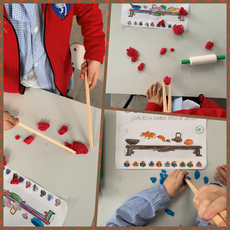 Hemos aprendido algunos de los alimentos típicos de Japón y hemos hecho nuestras réplicas en plastilina para practicar a coger los alimentos con los palillos, como hacen ellos.