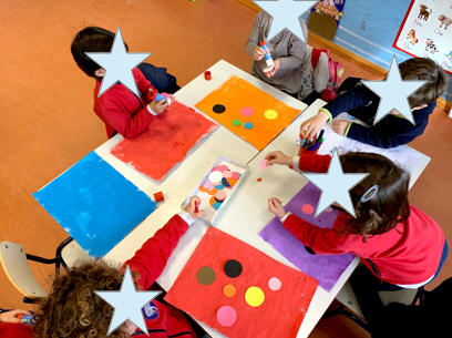 Como arte y aprendizaje van siempre de la mano, nos hemos atrevido a versionar la obra de Kandinsky «Algunos círculos», que nos recordó a muchísimas cosas del Universo: los planetas, los agujeros negros, el Big Bang… y hemos disfrutado muchísimo haciéndola. Tanto que la hemos hecho también en versión individual con las pizarras mientras nos tocaba el turno de pintar el cuadro.