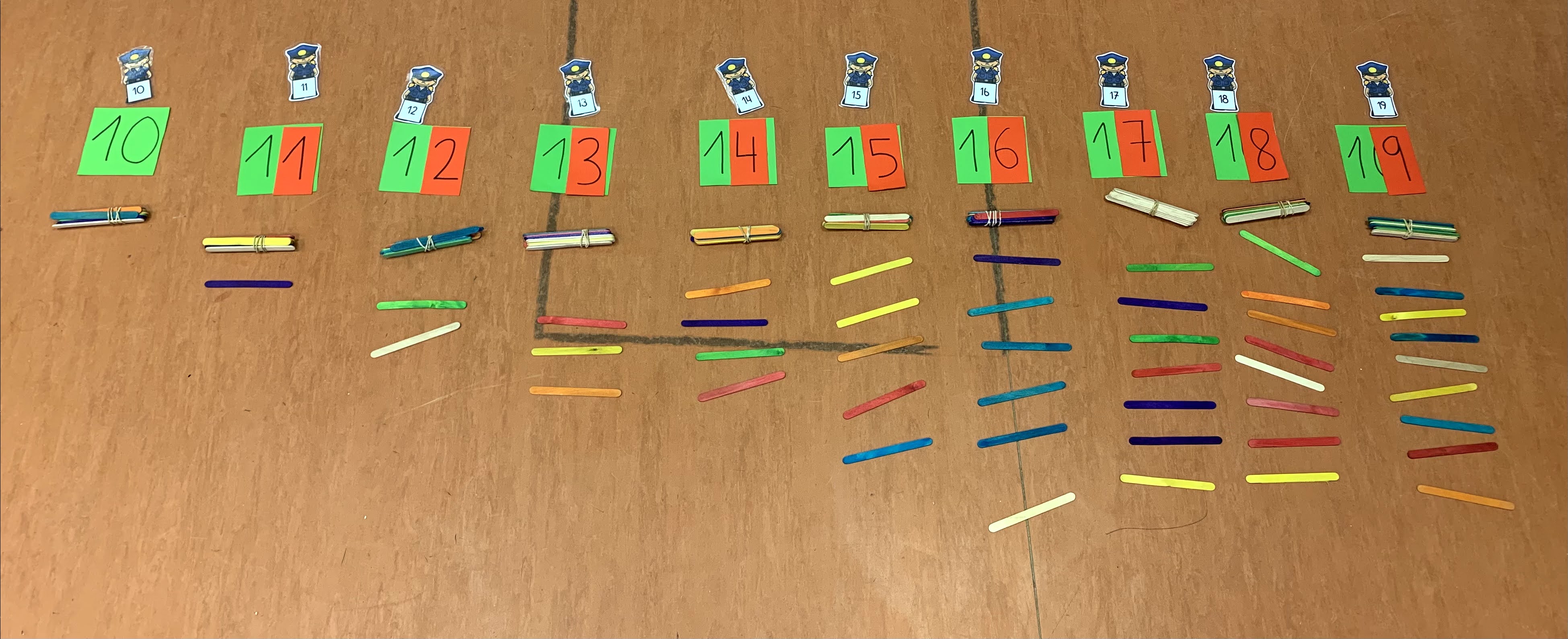 En el segundo trimestre estuvimos jugando con los niños a formar los números del 10 al 19 (familia del 10). Para ello hemos utilizado paquetitos de 10 depresores (ellos ya saben que un paquetito equivale a la DECENA) y luego palitos sueltos para indicar las unidades.