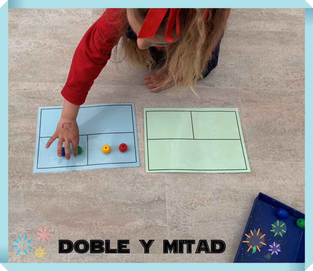 Hemos empezado a trabajar los conceptos de doble y mitad. Con esta sencillas cartulinas divididas en casillas han ido aprendido que para hacer el DOBLE de un número tienen que poner dos veces la misma cantidad y luego juntarlas en la casilla grande. Para conseguir la MITAD de un número tienen que hacer la operación contraria, poner la cantidad y luego repartirla a partes iguales en las dos casillas más pequeñas.