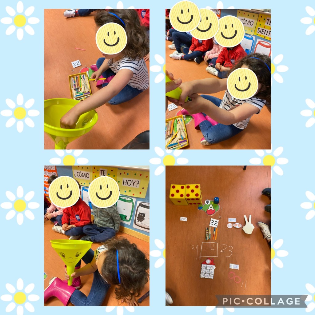 En la asamblea también aprovechamos las rutinas diarias para trabajar ABN. Os presentamos a EMBUDINA, la encargada de transformar diez unidades sueltas en UNA DECENA. El encargad@ a la hora de pasar lista le da un palito a cada niño y posteriormente los va contando hasta llegar a 10. Una vez que tiene 10 los mete de uno en uno en el embudo » EMBUDINA» para comprobar que los ha contado bien y en caso de haberlos contado bien EMBUDINA hace magia y les da una decena. De esta manera aprenden a contar más rápido y además entienden con mucha más facilidad el concepto de decena y de unidades sueltas.