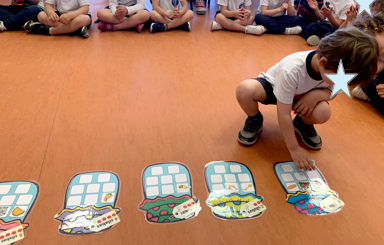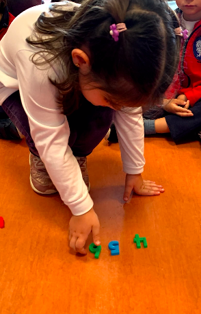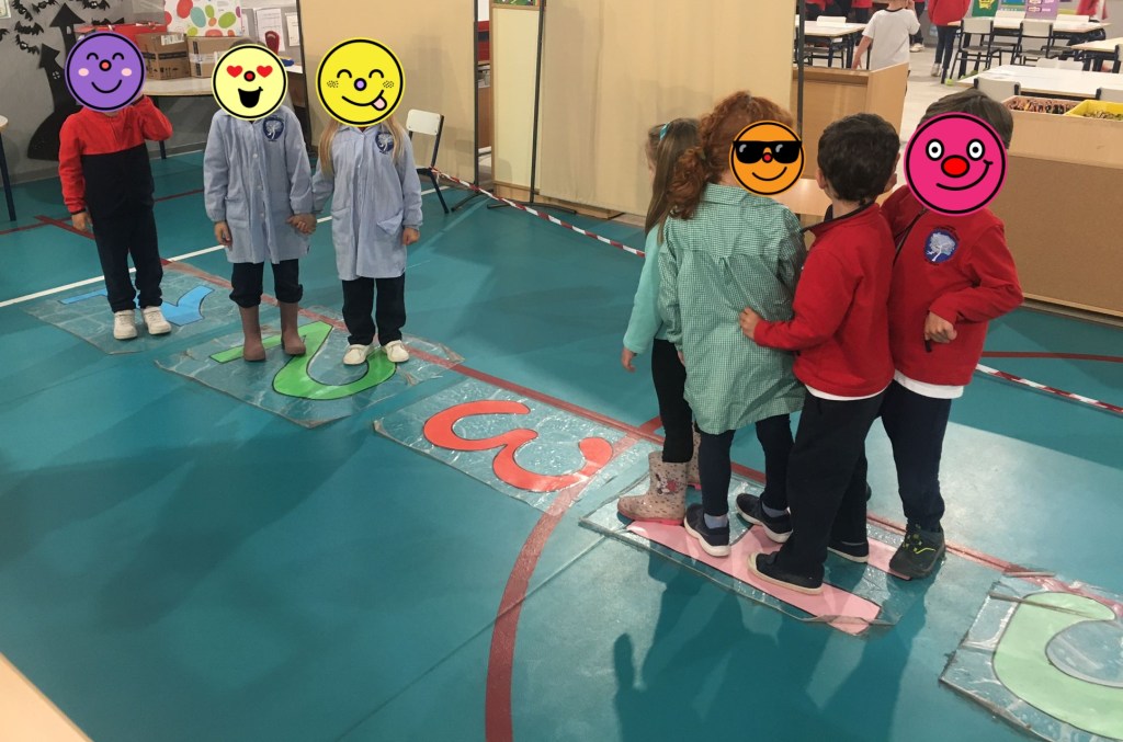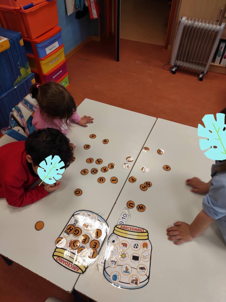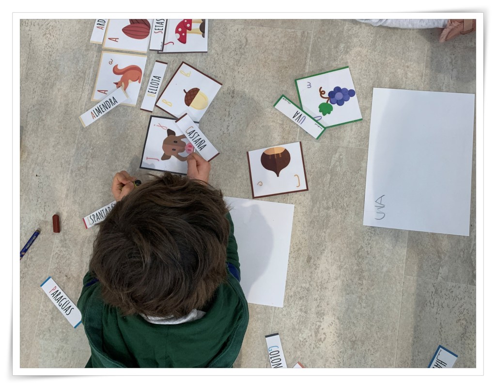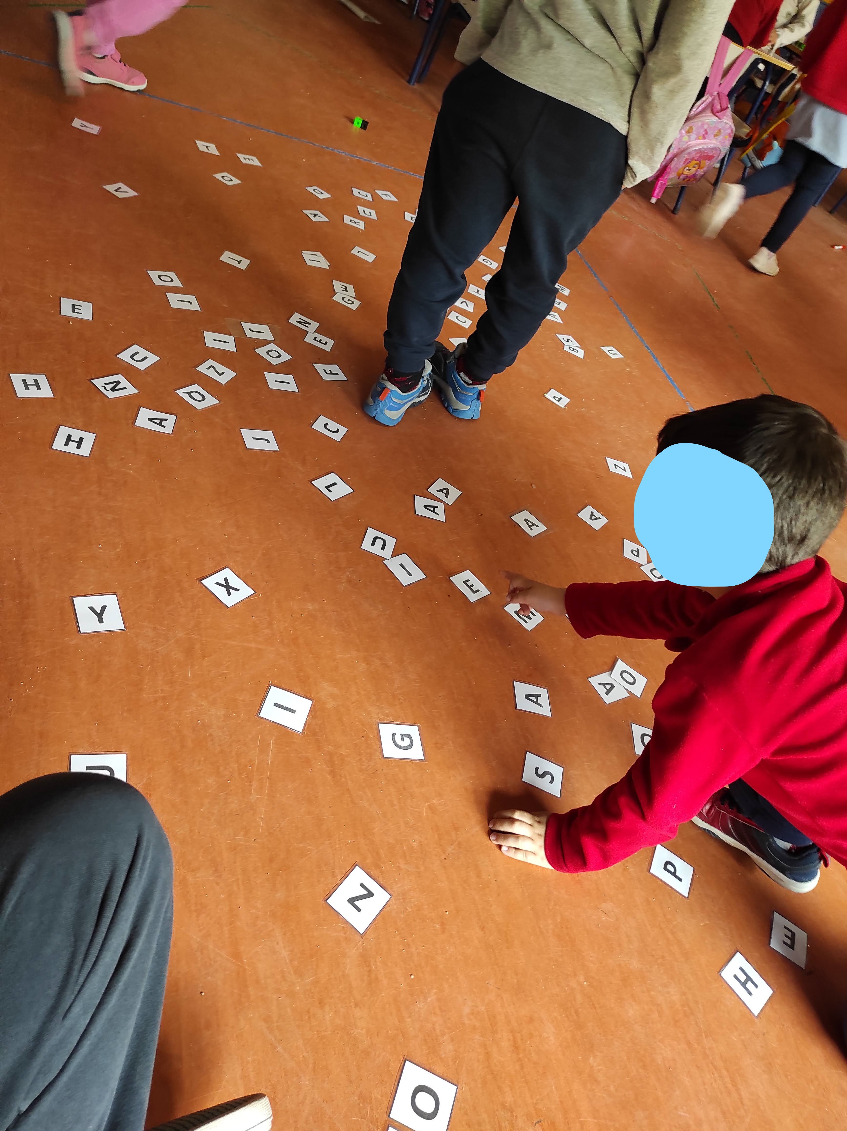En este otro juego lo que hacemos es poner muchas letras en el suelo y, por parejas, uno deberá buscar las letras que la profe les dice y el otro debe anotarlas en un papel. Al final, entre los dos, deberán intentar leer la palabra formada.