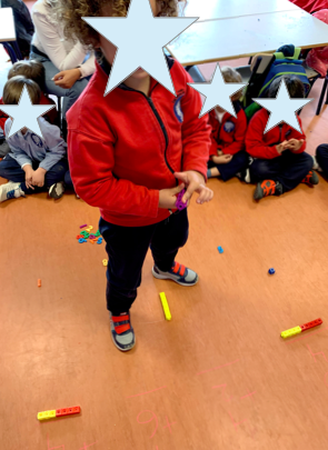 Además de estas explosiones de color, hicimos otro experimento en clase para explicar el Big Bang. Metimos trocitos de plastelina de colores dentro de un globo hinchado. Explotamos el globo y todo salió desperdigado por la clase. Les explicamos que tras la explosión y gracias a la gravedad, el polvo, las partículas, las rocas…se fueron uniendo formando los planetas, las estrellas, etc.