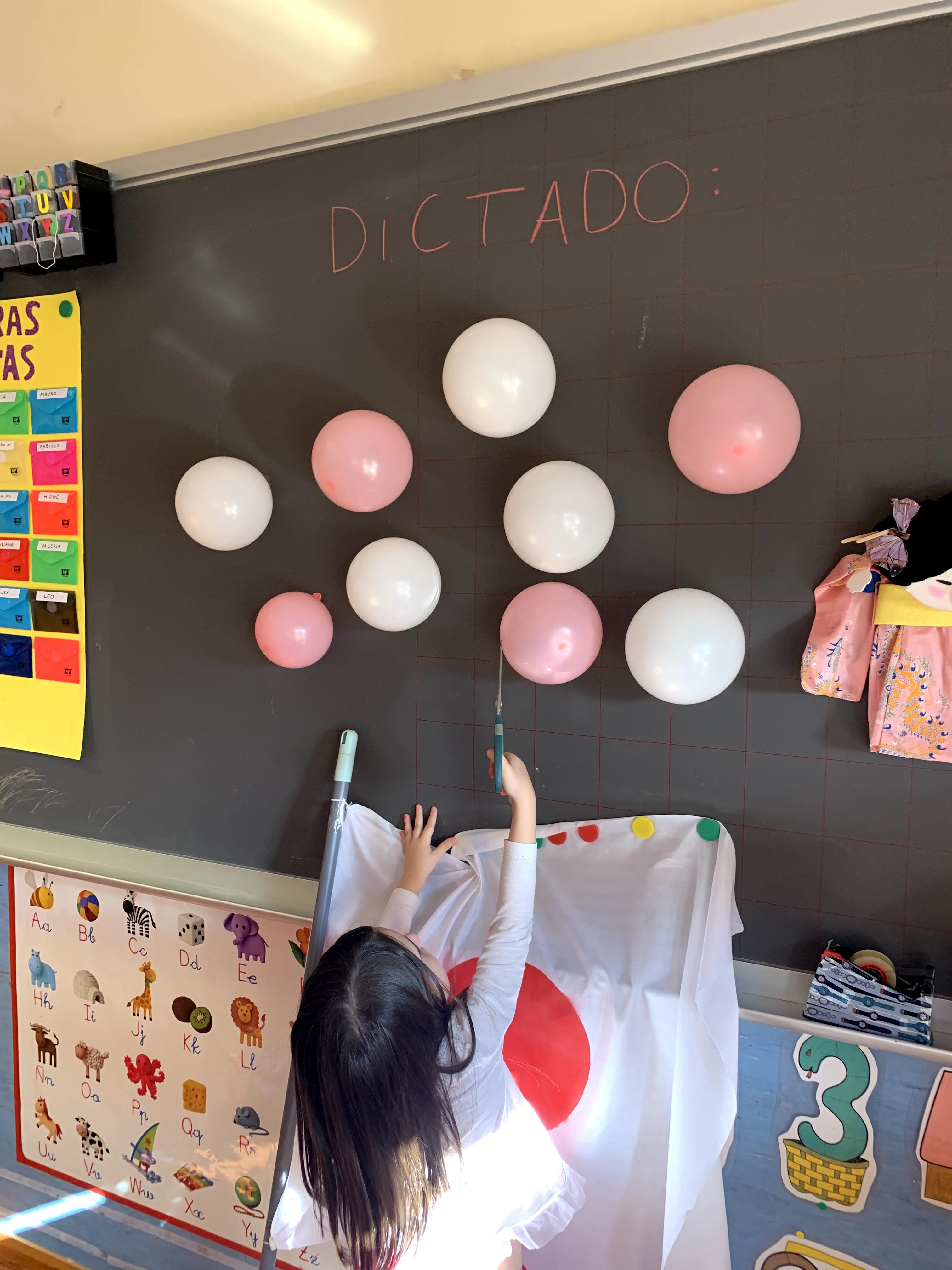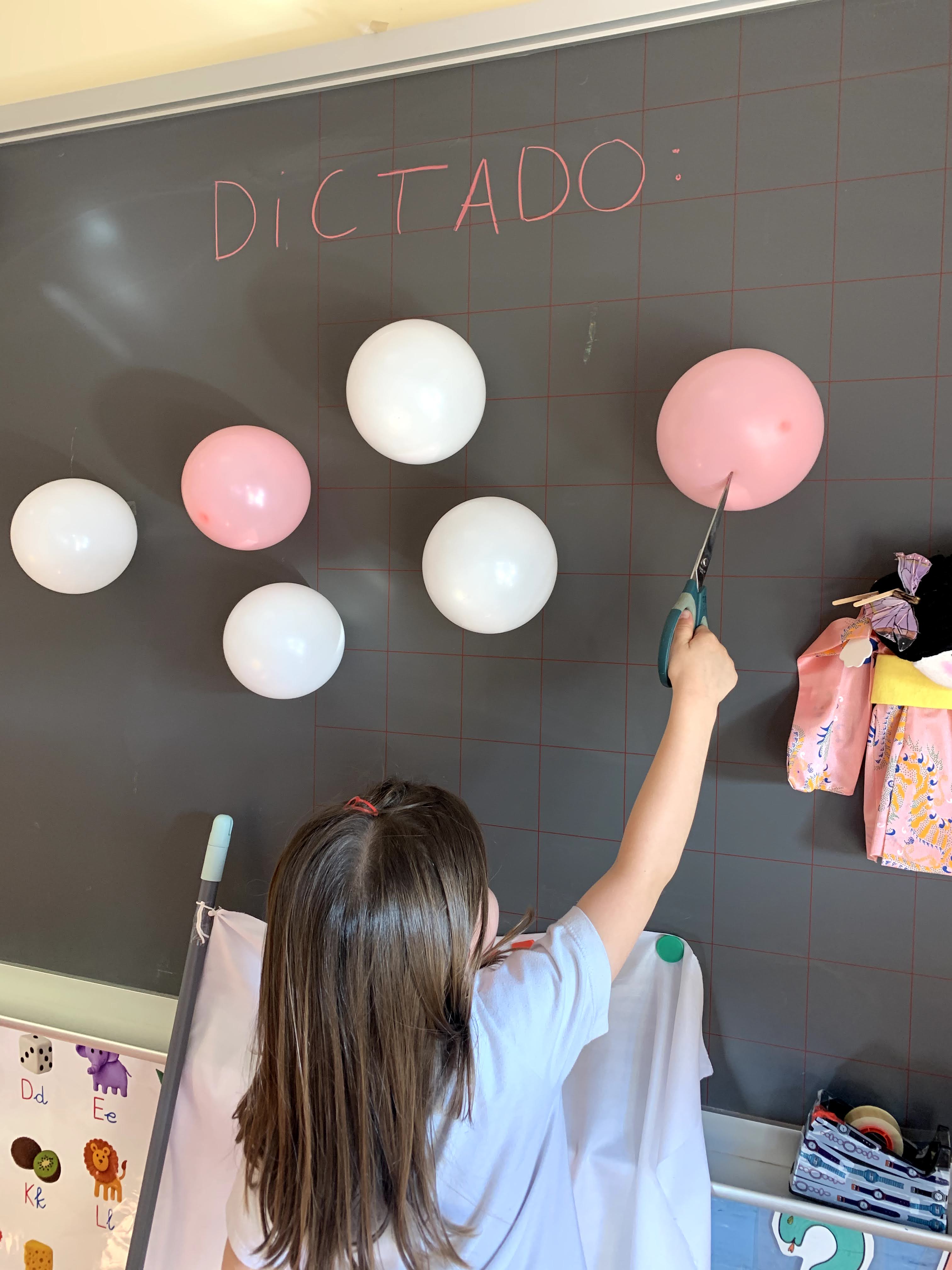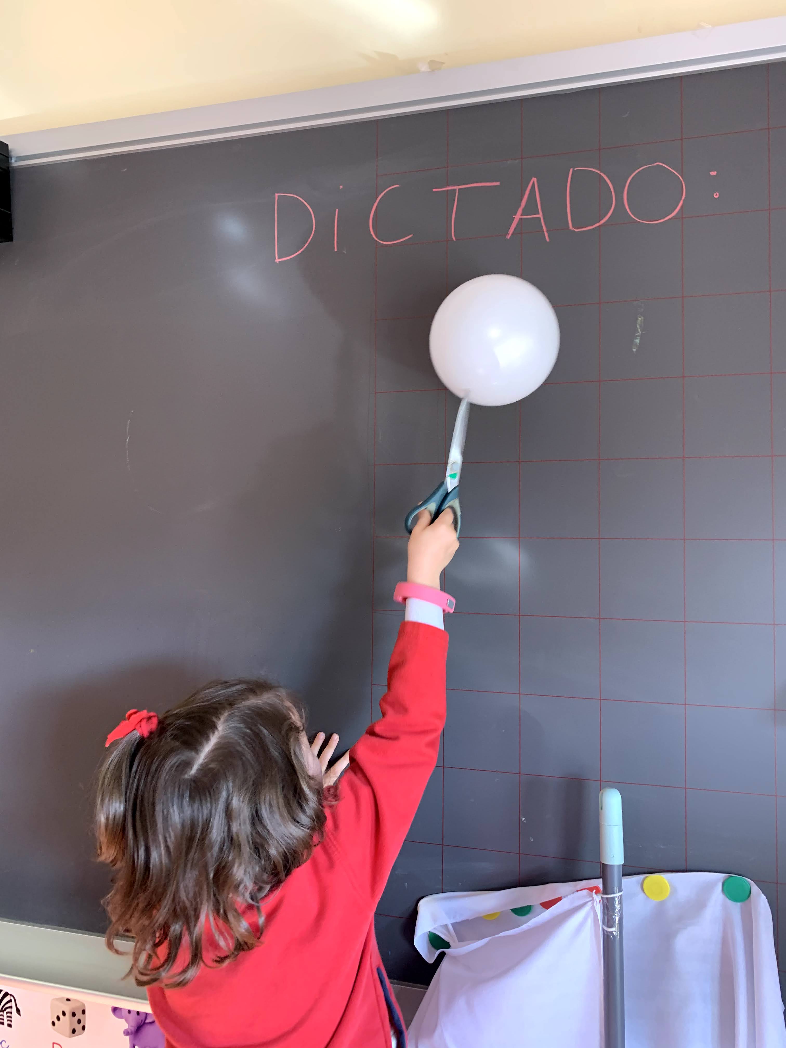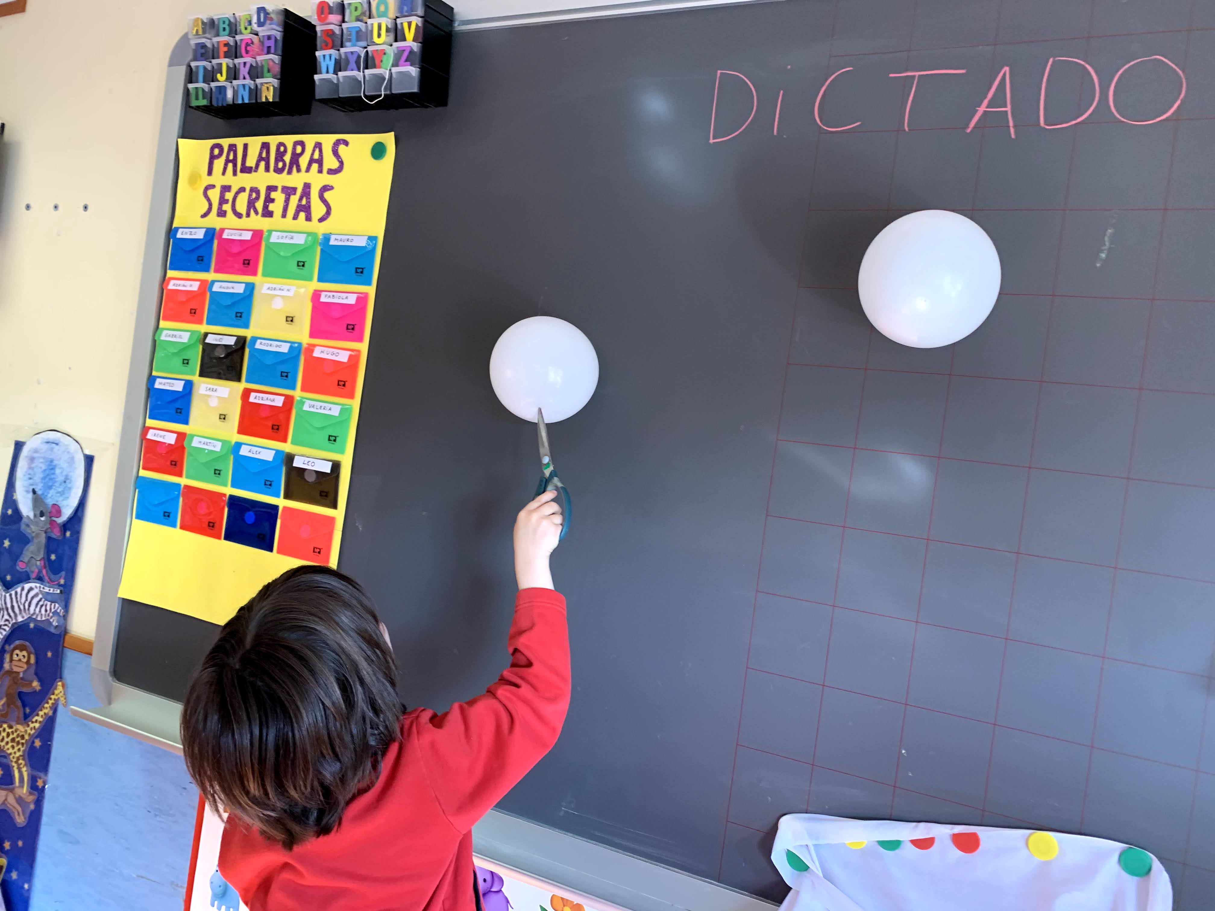 En este caso, era un dictado tanto de números como de palabras. Uno de los niños tenía que explotar un globo y, con ayuda de la profe, tenían que escribir el número o palabra correspondiente.