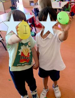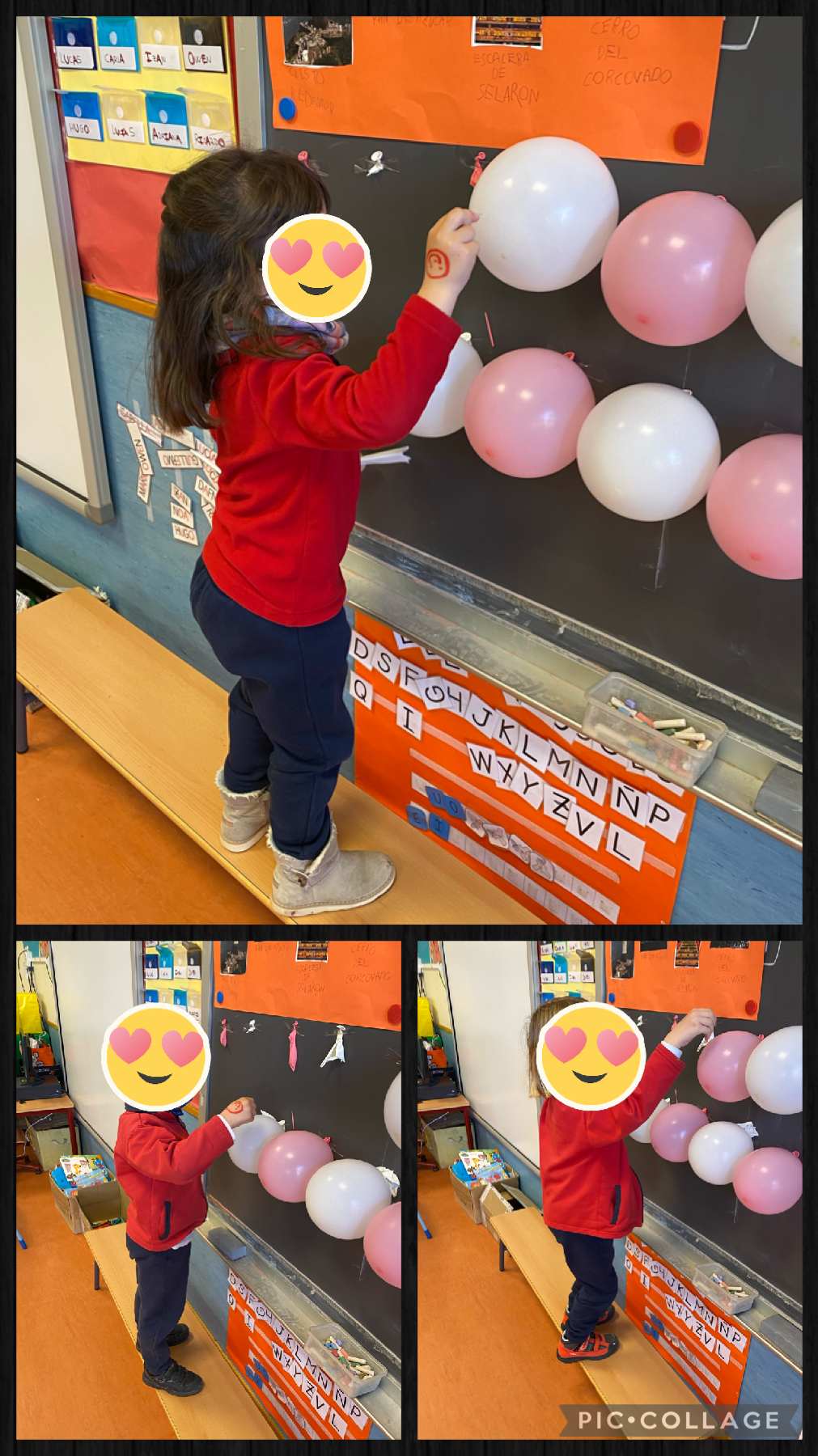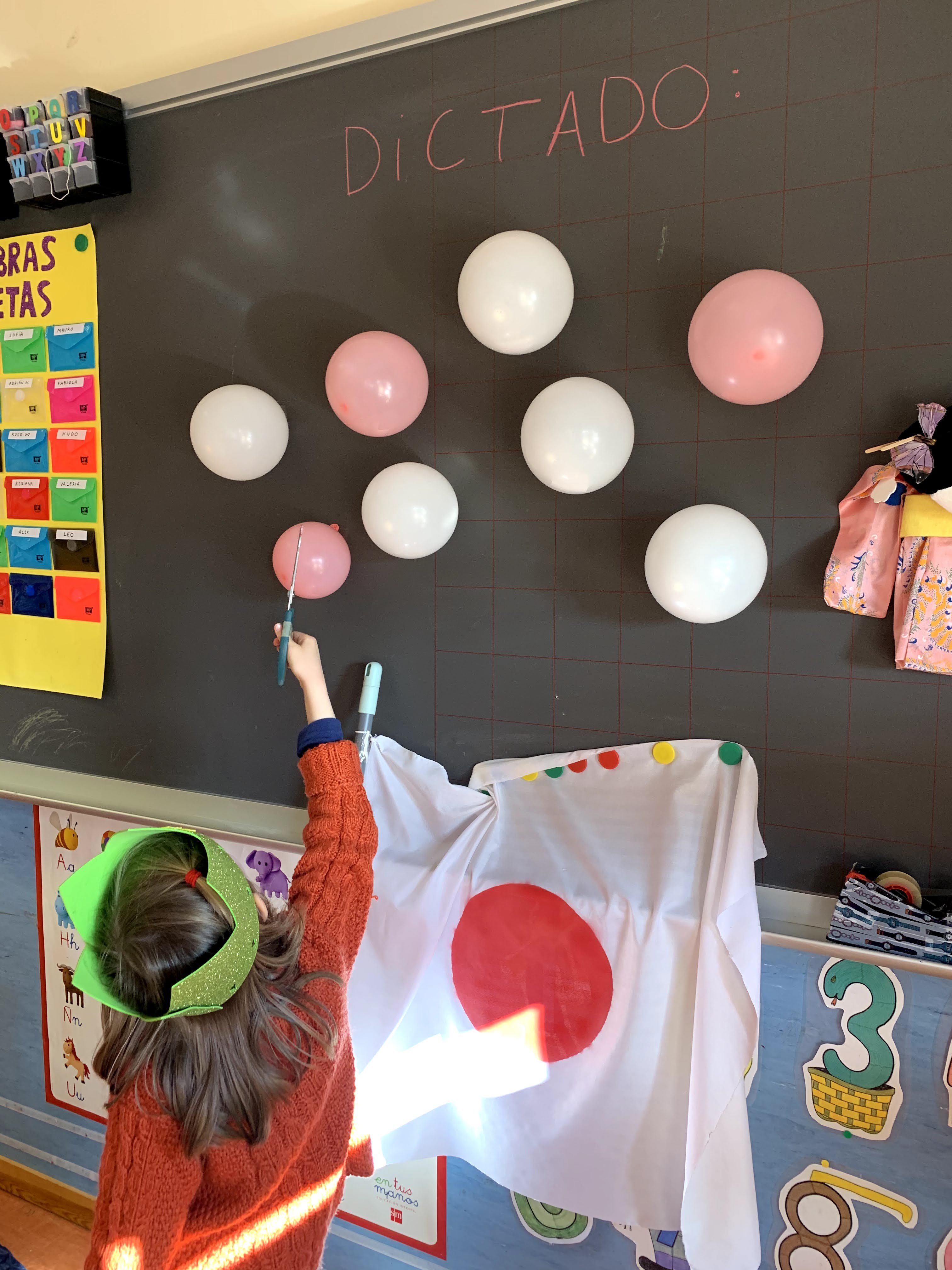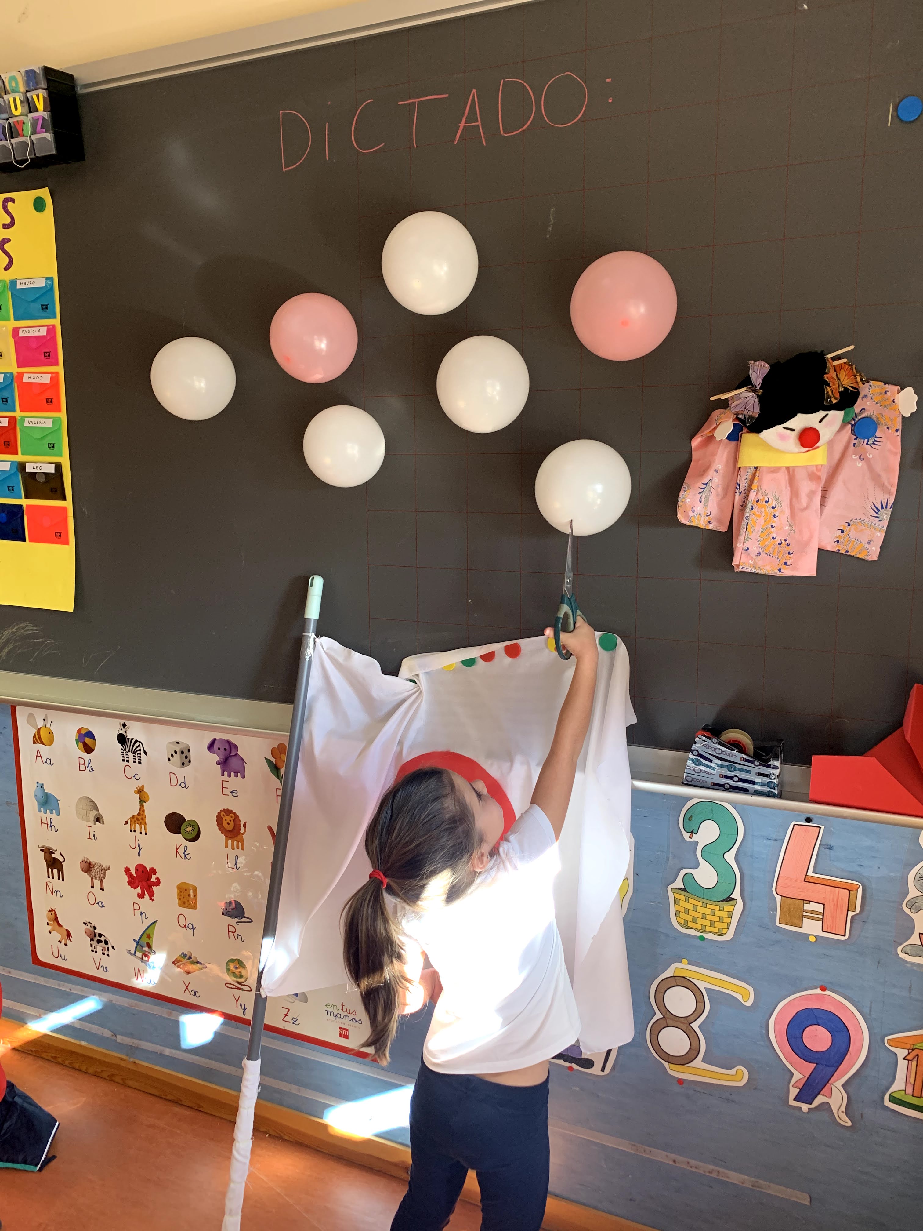 En este caso, era un dictado tanto de números como de palabras. Uno de los niños tenía que explotar un globo y, con ayuda de la profe, tenían que escribir el número o palabra correspondiente.