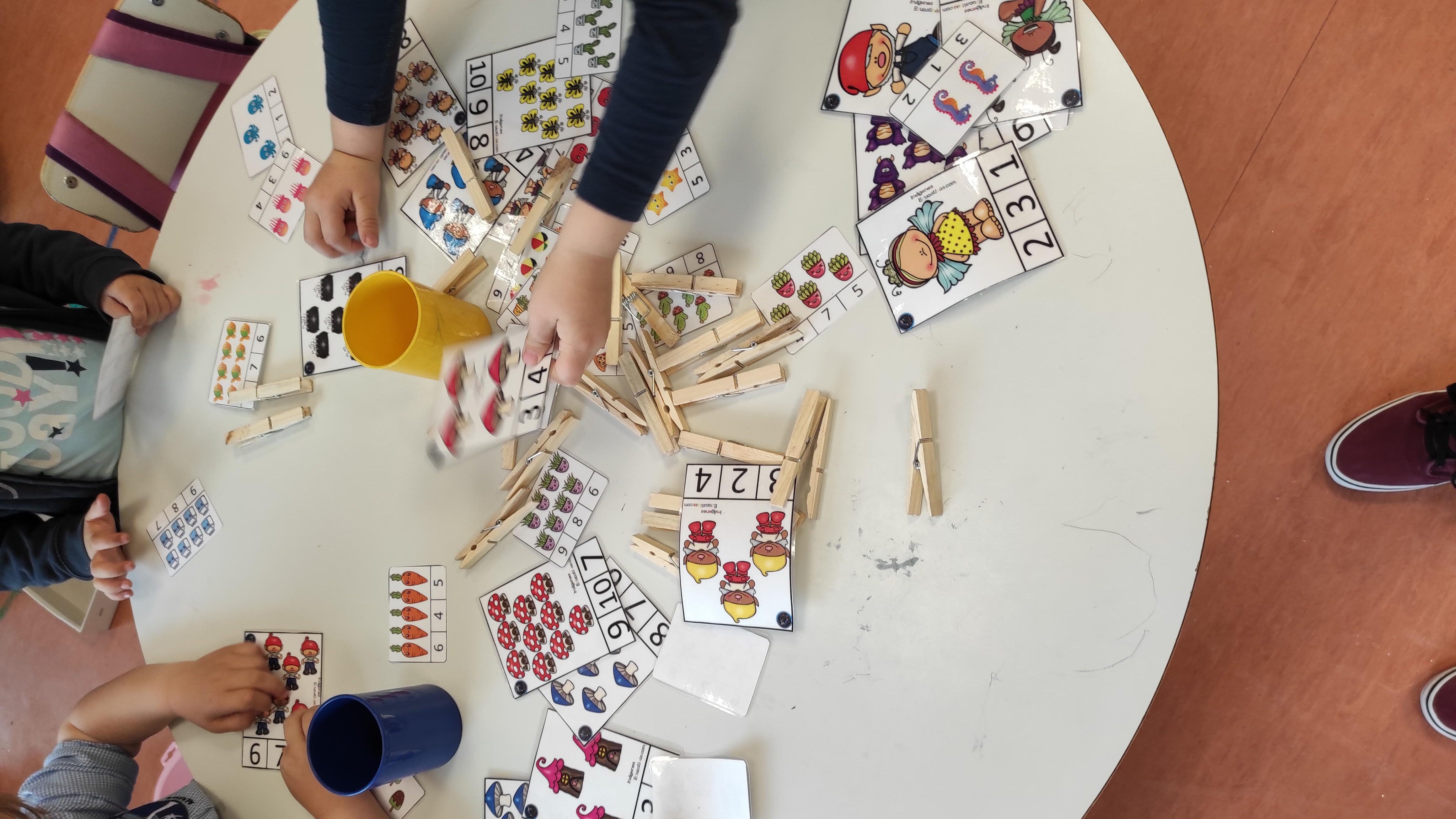 Este juego consiste en contar cuantos elementos aparecen en la tarjeta y colocar una pinza en el número que corresponda.