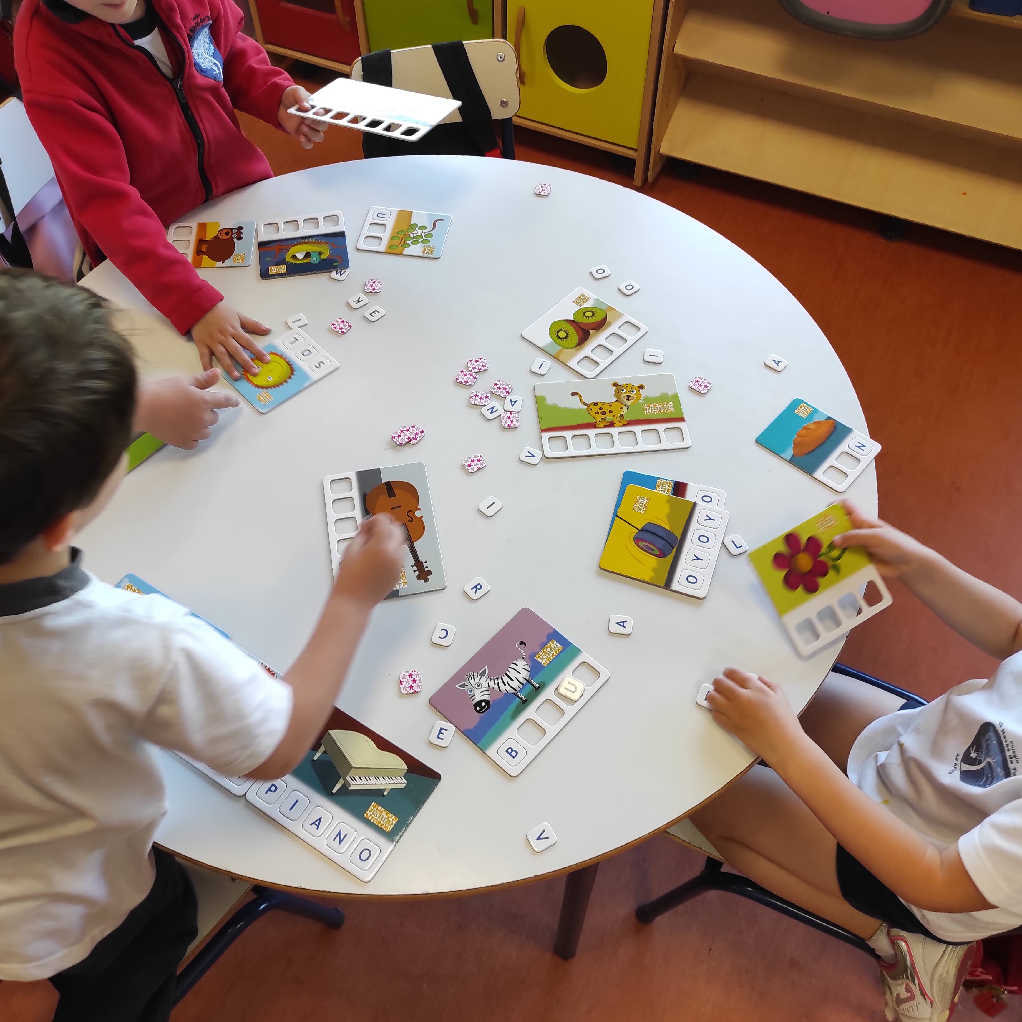 En este caso hemos aprovechado dos juegos que nos trajeron dos niños por sus cumpleaños. En uno de ellos aparecen unas imágenes con unas letras que se quitan y se ponen para componer la palabra que muestra la imagen. Lo que hemos hecho en este caso (se puede jugar de muchas maneras) es darles la imagen y las letras descolocadas para que las coloquen y, una vez colocadas correctamente, tienen que palmear la palabra para saber cuántas sílabas tiene para apretar tantos pulsadores de animales como sílabas tiene la palabra.