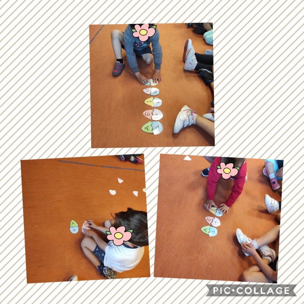 Como estamos aprendiendo las vocales en minúsculas también hemos jugado a formar el huevo, cada niño levanta la parte de un huevo y debe encontrar al compañero que tiene su pareja.