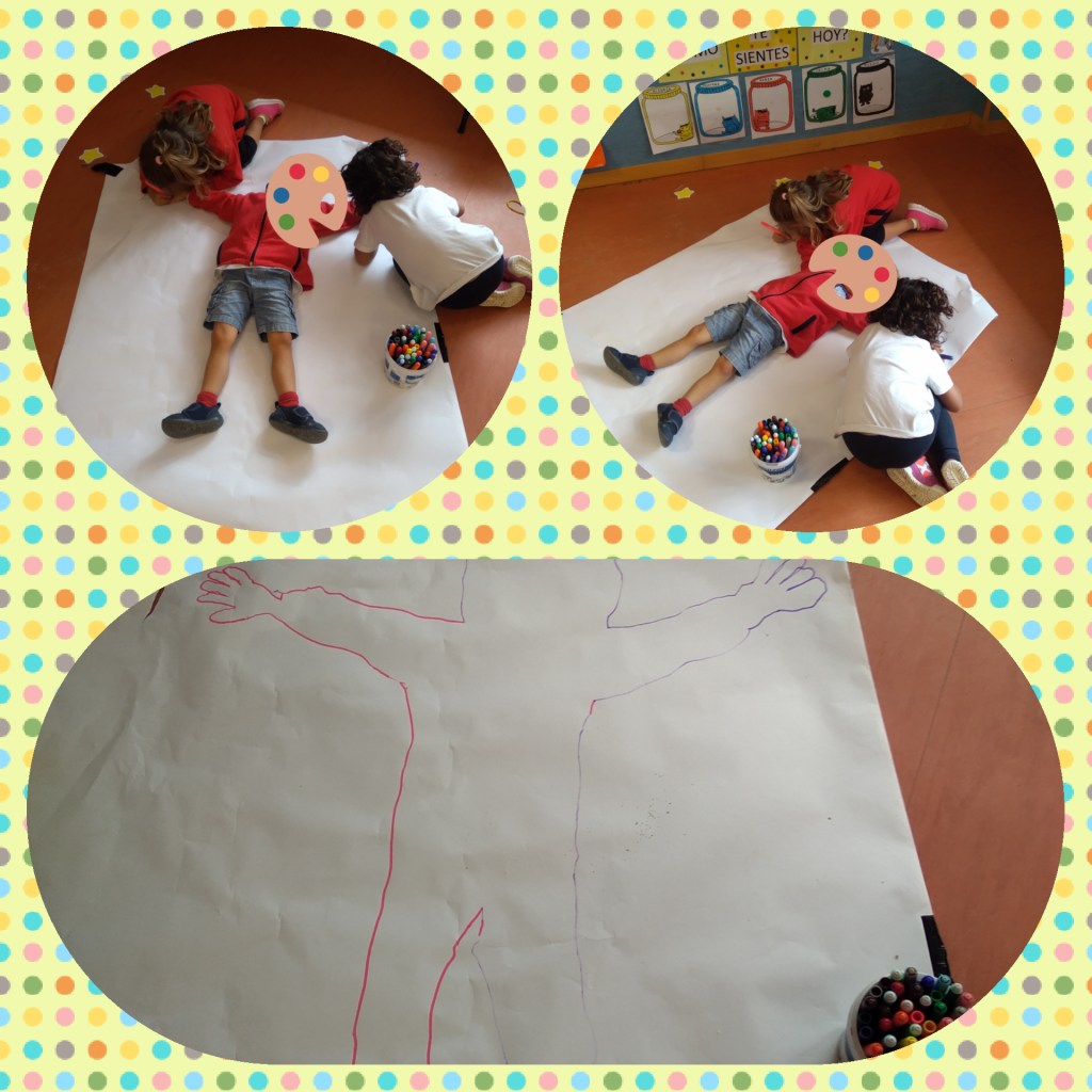 Esta actividad también les encanta, consiste en que un niño se tumbe en el suelo y el resto de sus compañeros tengan que copiar su su silueta. Además de trabajar el esquema corporal, son conscientes de los cambios que sufre su cuerpo y las diferencias que hay entre unos y otros.