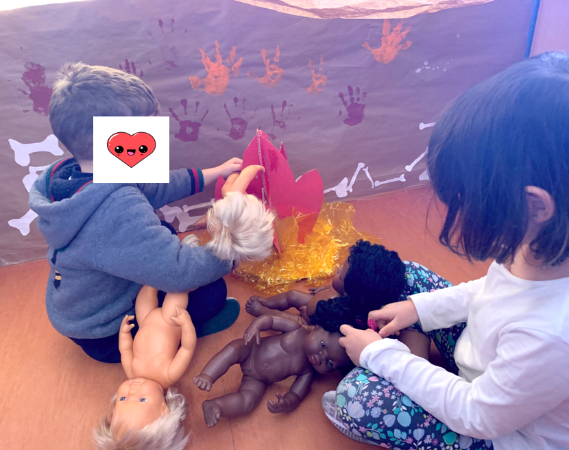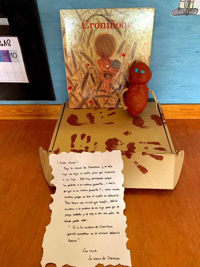 Al abrirlo se encontraron con una carta. Nos escribía la mamá de Croniñona, una niña prehistórica que había perdido su muñeca y nos pedía ayuda. Para que conociéramos mejor a su hija nos dejó un cuento. Tras leer el cuento y conocer mejor a la niña, aceptamos el reto de ayudarla a buscar su muñeca. Siguiendo las pistas de la mamá de Croniñona, encontramos la muñeca de Croniñona en el arenero del patio. ¿Qué hacía allí?¿Cómo habían llegado Croniñona, su mamá y la muñeca desde la Prehistoria? Es un misterio, pero lo que sí es seguro es que los peques de 4 años están súper motivados y dispuestos a investigar mucho sobre la Prehistoria.